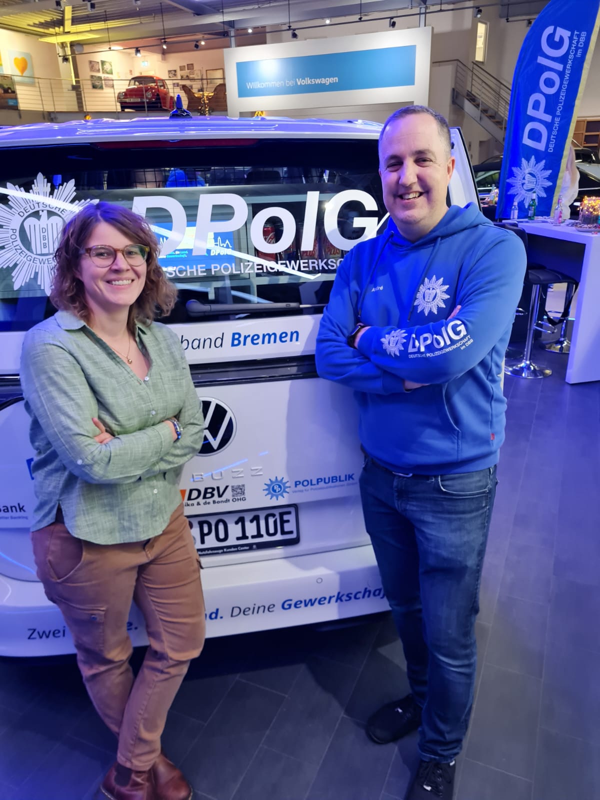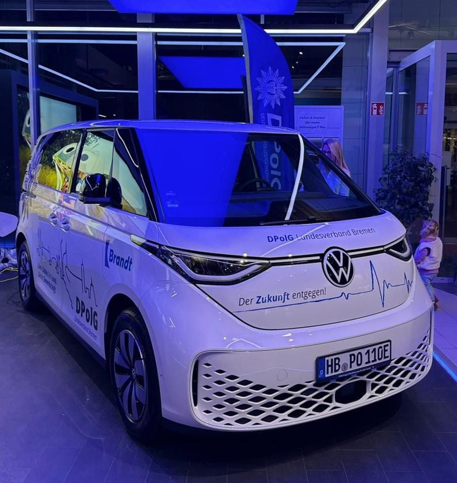Julia Wagner von POLPUBLIK war ebenfalls vor Ort. Mit dem ID Buzz ist die DPolG Bremen ab sofort nicht nur sicher im Straßenverkehr unterwegs, sondern auch nachhaltig.